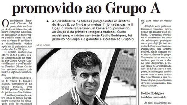 Emanuel Câmara, ex-presidente da Câmara Municipal do Porto Moniz, foi promovido ao Grupo A dos árbitros da primeira categoria nacional, ao classificar-se na terceira posição entre os árbitros do Grupo B. Corria o ano de 2001. Conteúdo Reservado A subida de categoria foi também feita por Carlos Xistra (Castelo Branco) e por Francisco Ferreira (Viana Castelo). Mas houve outro madeirense que também subiu de categoria, desta feita para o grupo B, Elmano Santos. Ao DIÁRIO, na época, Emanuel Câmara asVer artigo completo em dnoticias.pt